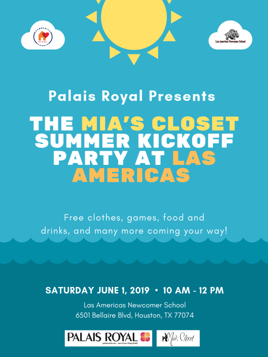 We couldn’t be more excited to share with you that we will be hosting a Summer Kick Off shopping event on Saturday, June 1, 2019, in partnership with our sponsor, Palais Royal, to benefit the students of Las Americas Newcomer School.